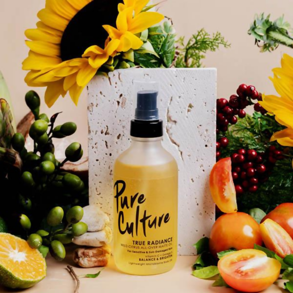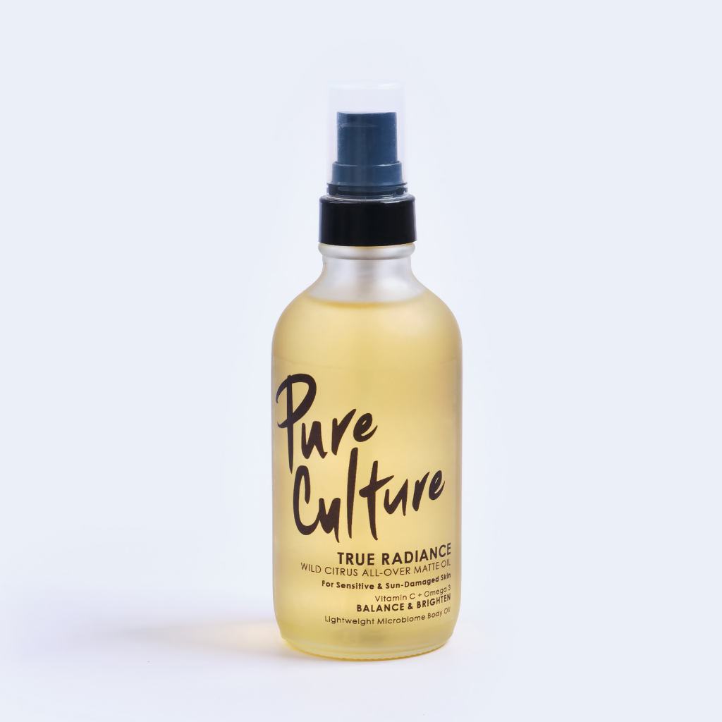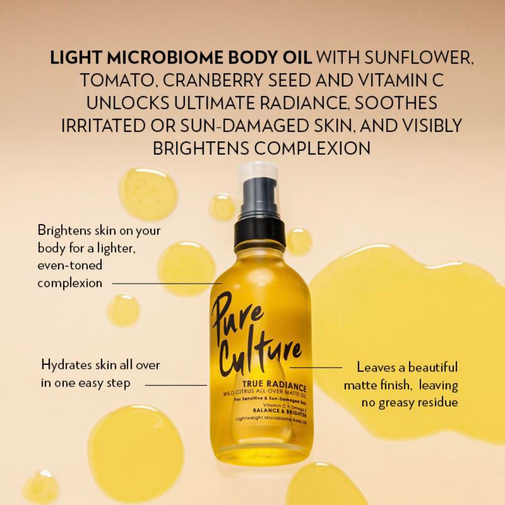 Elevate your body care game with True Radiance Wild Citrus All-Over Matte Oil. Crafted specifically for sensitive and sun-damaged skin, this remarkable body oil is your gateway to a luminous and radiant complexion. Not your average body or massage oil - this is a high-performance blend of luxury oils and powerful actives – Sunflower Oil, Phyto-Squalane, Jojoba Oil plus Tomato Seed rich in lycopene, Cranberry Seed rich in Omega 3 and 6, and Vitamins C and E – here to unlock your skin’s dazzling glow. Say hello to your new bestie for lighter skin all over!