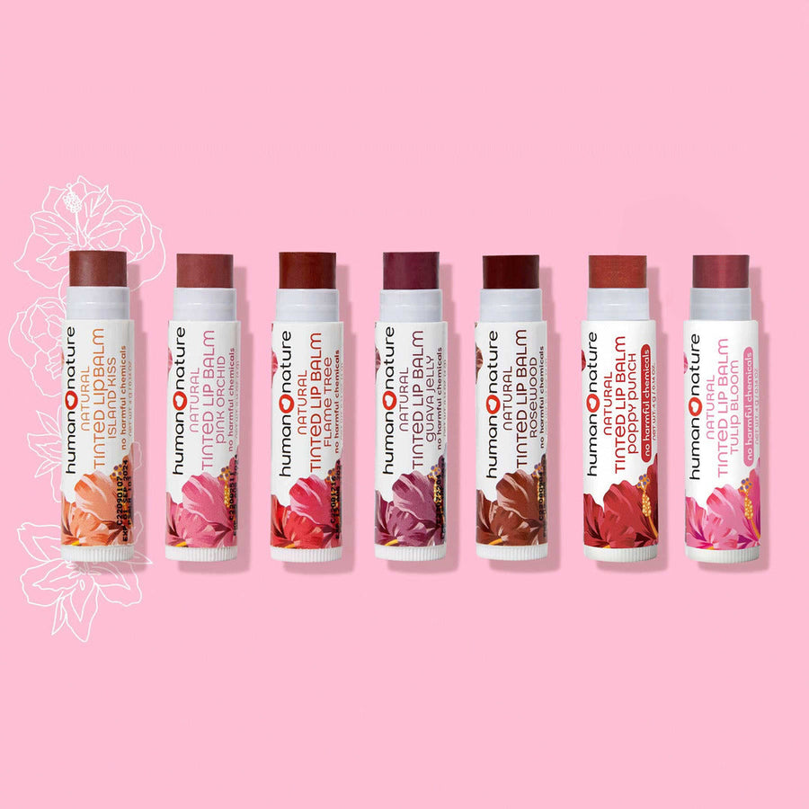 Tinted Lipbalm in Island Kiss, Tulip Bloom, Poppy punch, Flame Tree, Pink Orchid, Guava Jelly